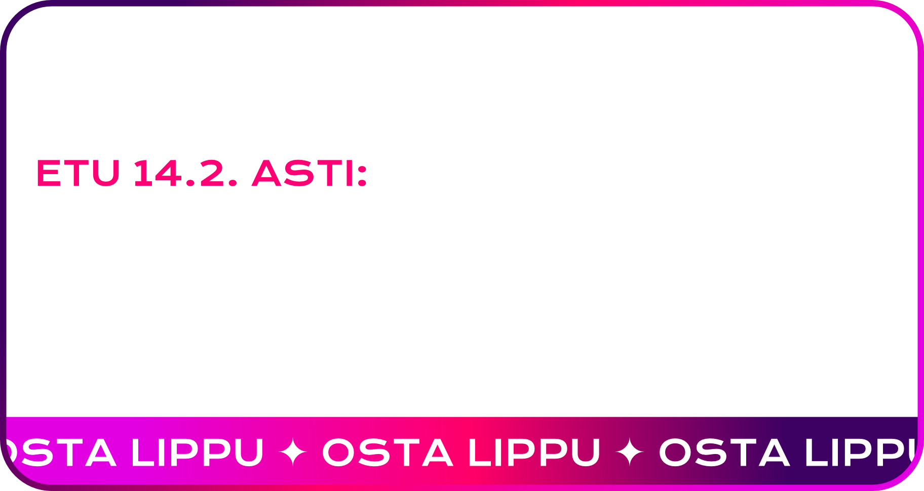 HUOM! Olemme saaneet tietoomme, että nimissämme on liikkunut huijausprofiileja sosiaalisessa mediassa. Emme koskaan pyydä yksityis- tai pankkitietojasi, emmekä pyydä tilauksia tai henkilötunnuksen tarvitsevia vahvistuksia esim. palkintojen noutoon. Mikäli olet voittanut palkinnon – olemme pyytäneet sinua olemaan yhteydessä meihin sähköpostitse: info@eventmedia.fi.